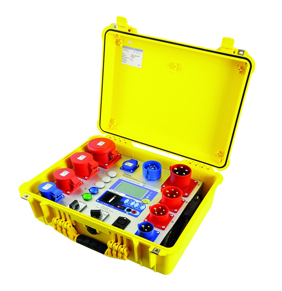 Tragbares Leitungsprüfgerät in stabilem Kunststoffkoffer zur Prüfung von Verlängerungsleitungen und elektrischen Betriebsmitteln gemäß DIN VDE 0701/0702 und den Unfallverhütungs-Vorschriften der Berufsgenossen schaften DGUV Vorschrift 3. Sämtliche Einbauten unter aufklappbarem Deckel eingebaut. Der Netzanschluss erfolgt über ein fest angeschlossenes Kabel mit Schutzkontakt-Stecker 16 A.
